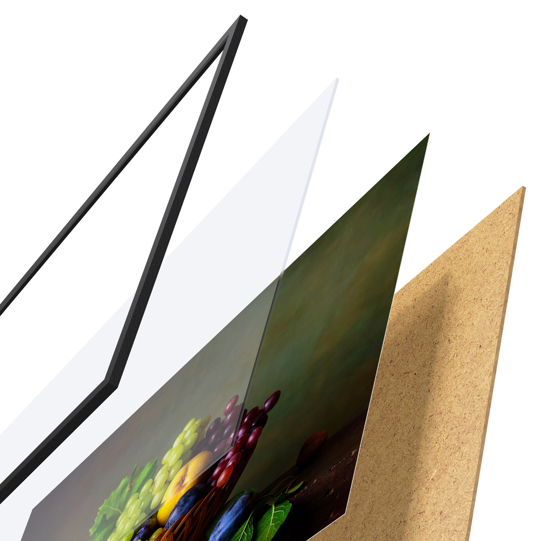 De poster bestaat uit een frame, plexiglas, geprinte afbeelding en spaanplaat achterkant. De poster kan meteen aan de muur worden gehangen dankzij de bevestigingen op de achterkant.