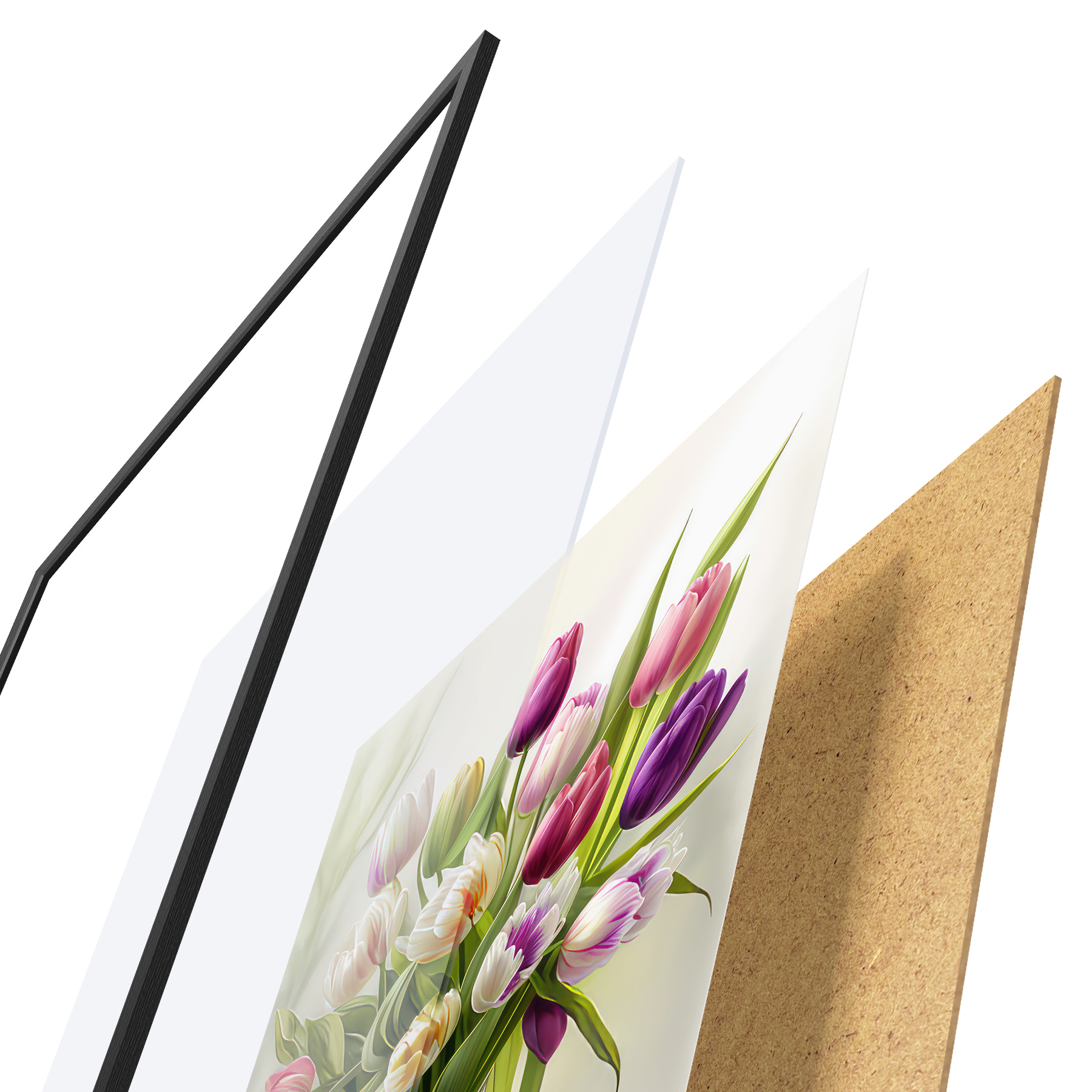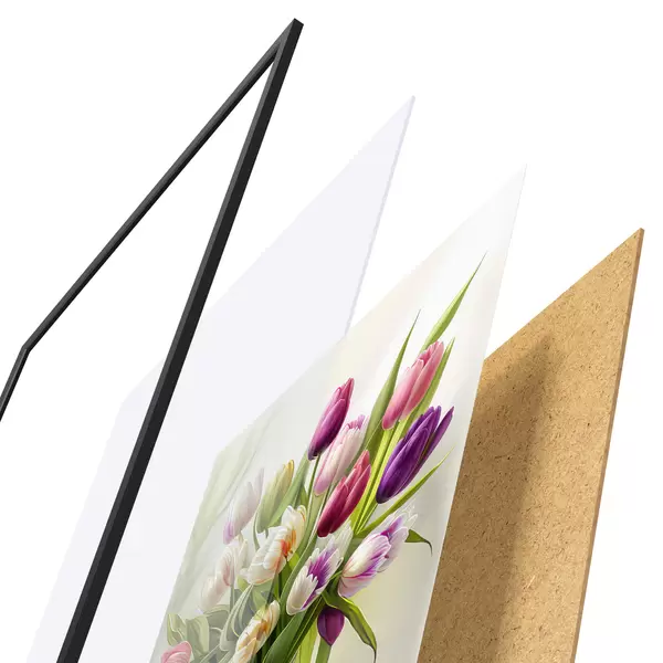 De poster bestaat uit een frame, plexiglas, geprinte afbeelding en spaanplaat achterkant. De poster kan meteen aan de muur worden gehangen dankzij de bevestigingen op de achterkant.