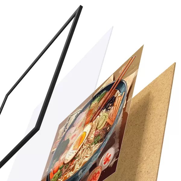 De poster bestaat uit een frame, plexiglas, geprinte afbeelding en spaanplaat achterkant. De poster kan meteen aan de muur worden gehangen dankzij de bevestigingen op de achterkant.