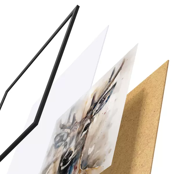 De poster bestaat uit een frame, plexiglas, geprinte afbeelding en spaanplaat achterkant. De poster kan meteen aan de muur worden gehangen dankzij de bevestigingen op de achterkant.