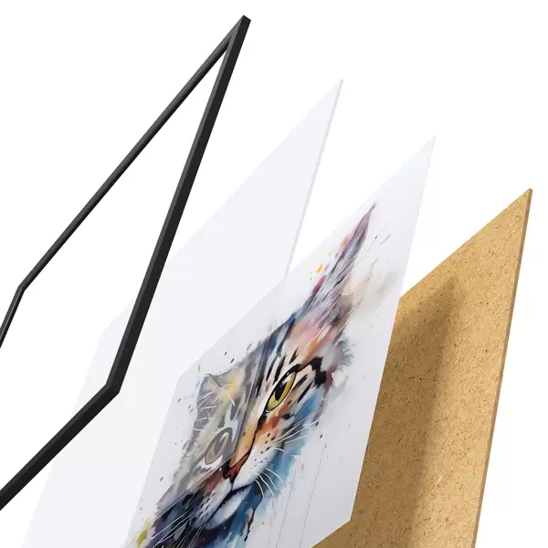 De poster bestaat uit een frame, plexiglas, geprinte afbeelding en spaanplaat achterkant. De poster kan meteen aan de muur worden gehangen dankzij de bevestigingen op de achterkant.