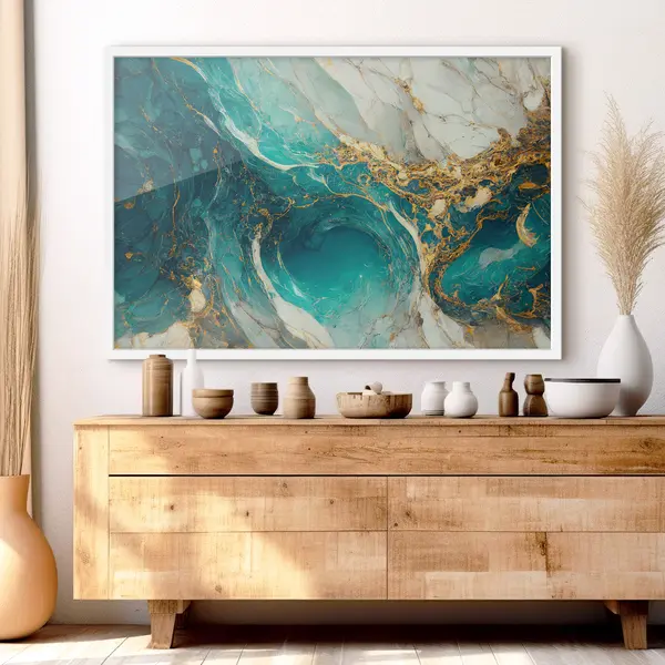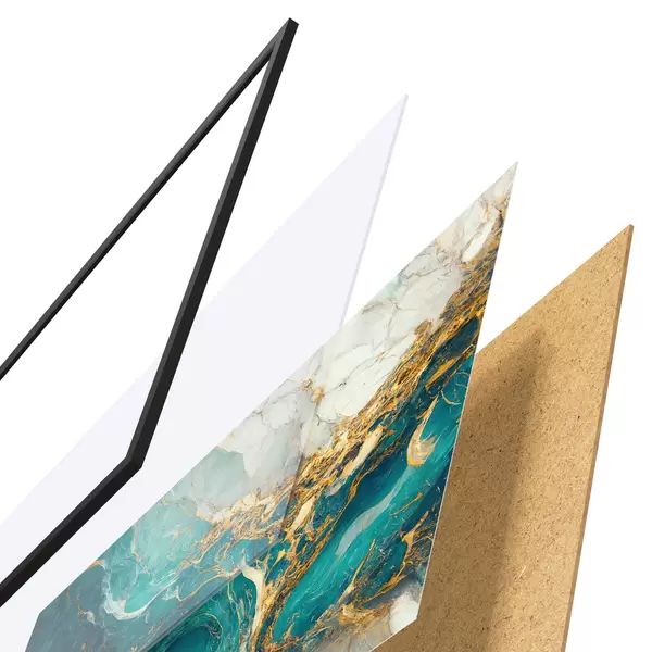 De poster bestaat uit een frame, plexiglas, geprinte afbeelding en spaanplaat achterkant. De poster kan meteen aan de muur worden gehangen dankzij de bevestigingen op de achterkant.