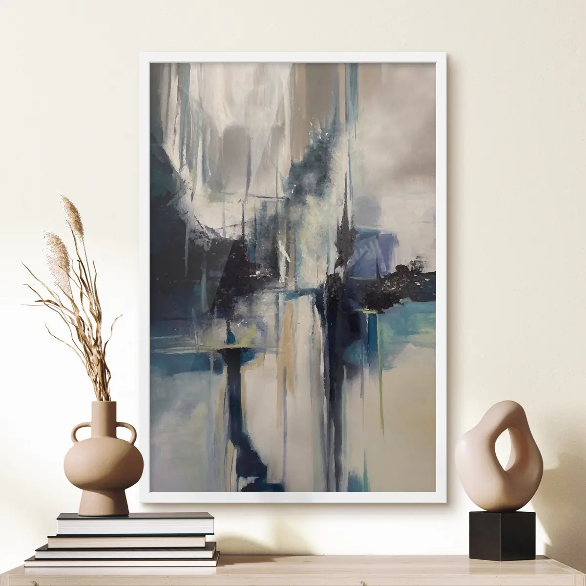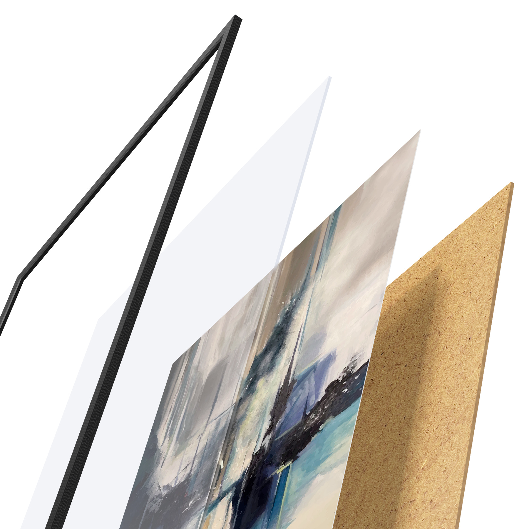De poster bestaat uit een frame, plexiglas, geprinte afbeelding en spaanplaat achterkant. De poster kan meteen aan de muur worden gehangen dankzij de bevestigingen op de achterkant.