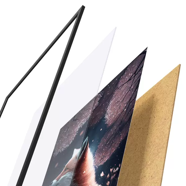 De poster bestaat uit een frame, plexiglas, geprinte afbeelding en spaanplaat achterkant. De poster kan meteen aan de muur worden gehangen dankzij de bevestigingen op de achterkant.