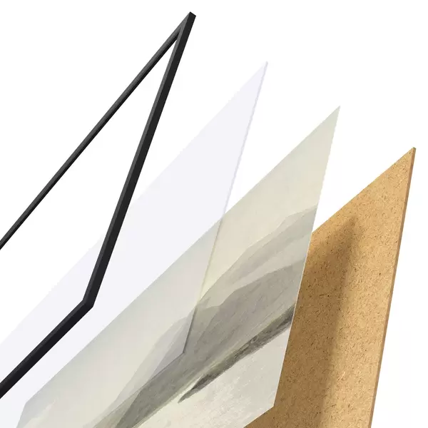 De poster bestaat uit een frame, plexiglas, geprinte afbeelding en spaanplaat achterkant. De poster kan meteen aan de muur worden gehangen dankzij de bevestigingen op de achterkant.