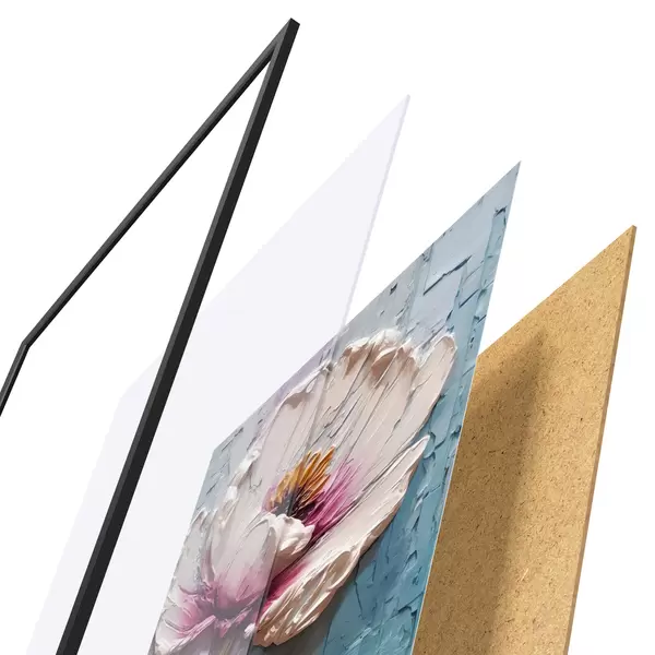 De poster bestaat uit een frame, plexiglas, geprinte afbeelding en spaanplaat achterkant. De poster kan meteen aan de muur worden gehangen dankzij de bevestigingen op de achterkant.