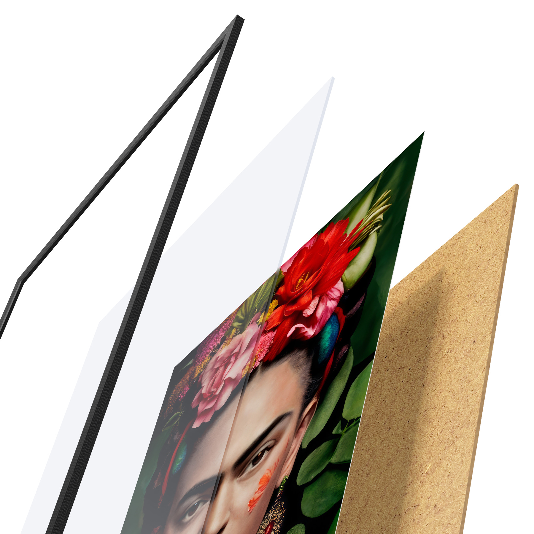 De poster bestaat uit een frame, plexiglas, geprinte afbeelding en spaanplaat achterkant. De poster kan meteen aan de muur worden gehangen dankzij de bevestigingen op de achterkant.