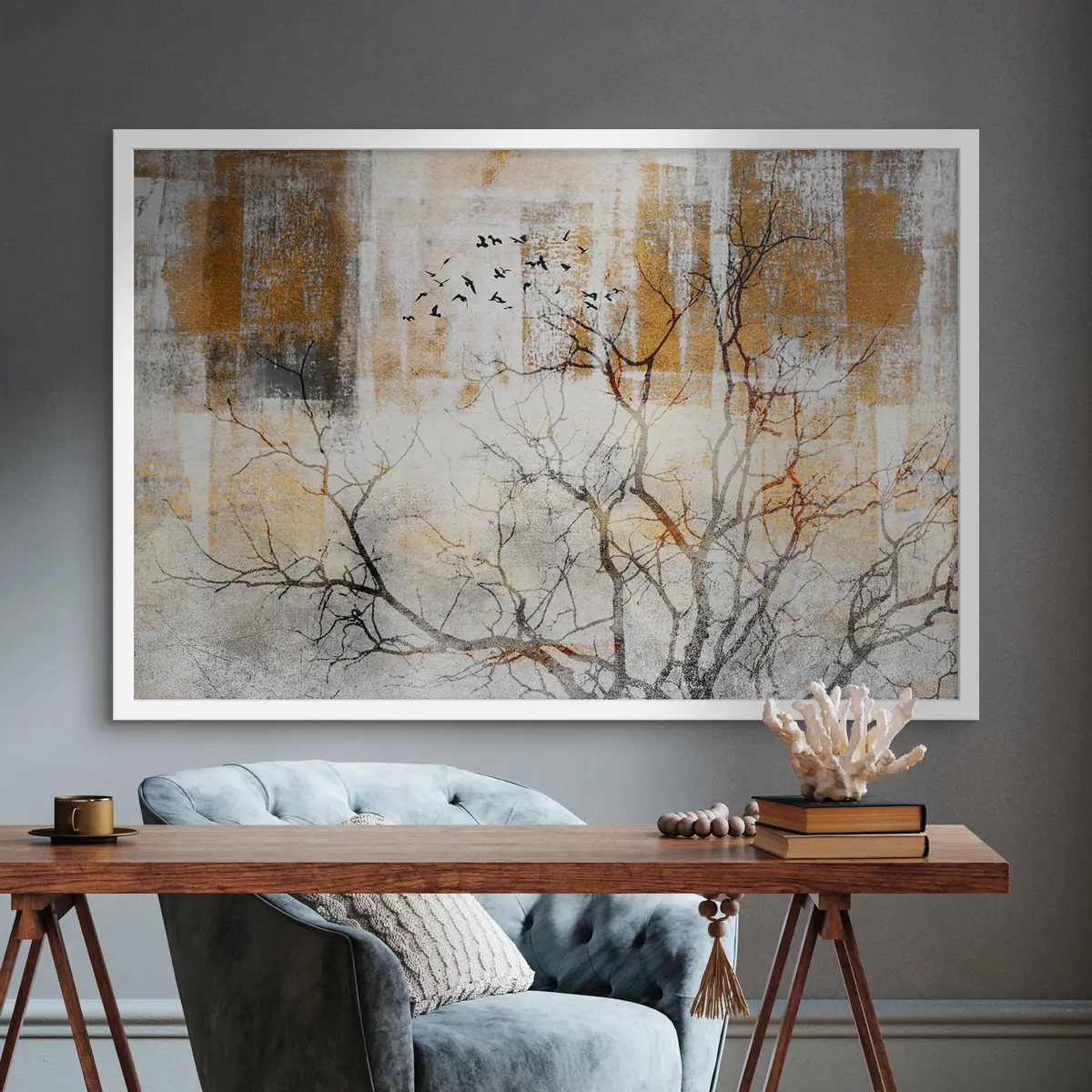Poster Rustig landschap met vogels in vlucht Nr f33076