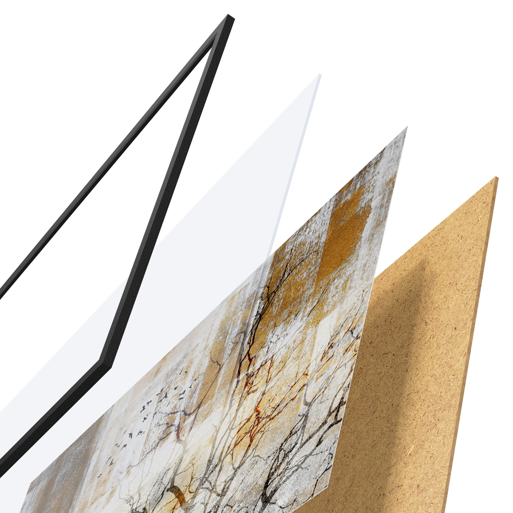 De poster bestaat uit een frame, plexiglas, geprinte afbeelding en spaanplaat achterkant. De poster kan meteen aan de muur worden gehangen dankzij de bevestigingen op de achterkant.
