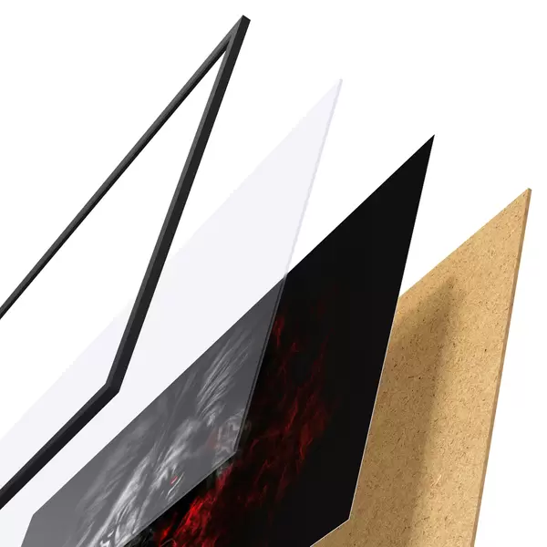 De poster bestaat uit een frame, plexiglas, geprinte afbeelding en spaanplaat achterkant. De poster kan meteen aan de muur worden gehangen dankzij de bevestigingen op de achterkant.