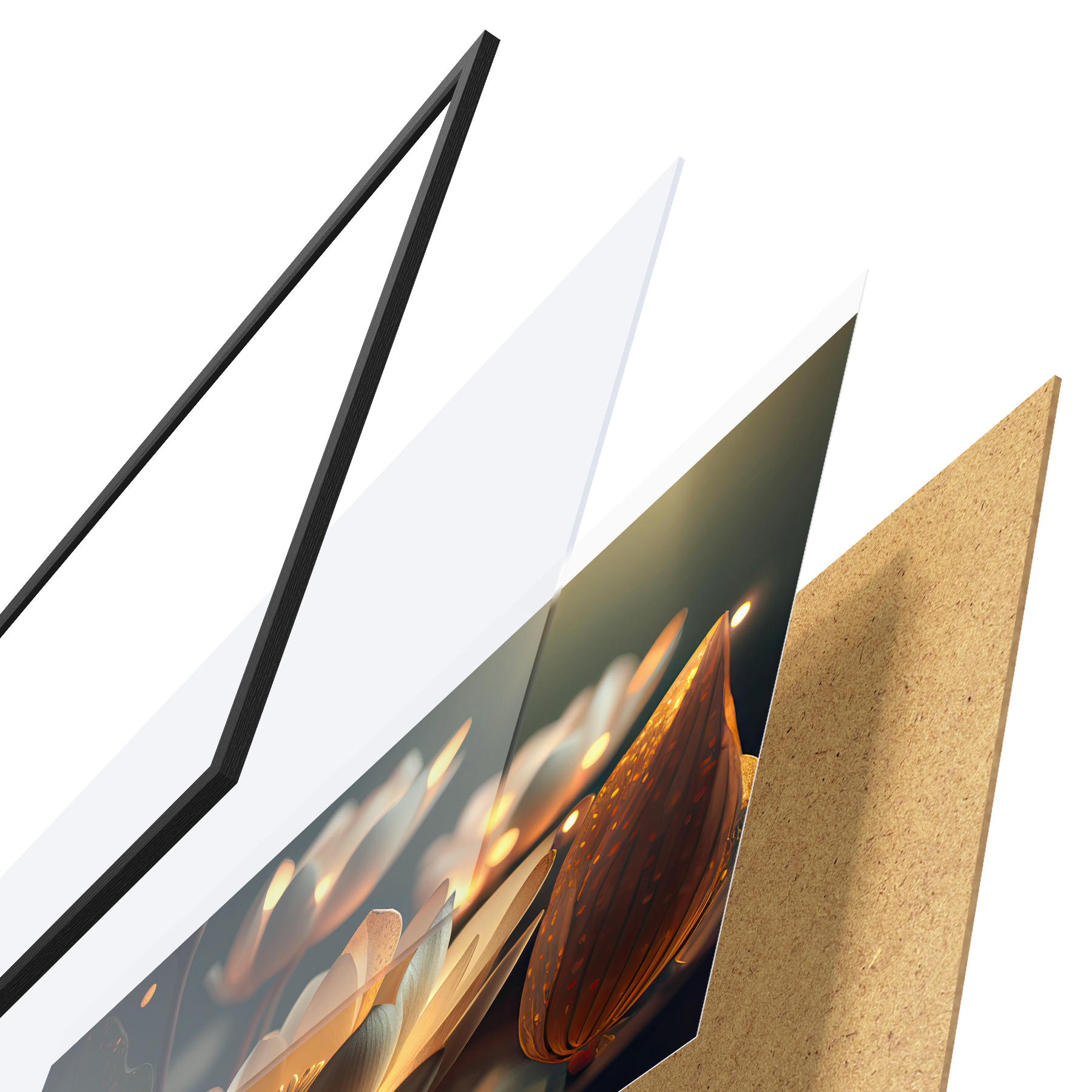 De poster bestaat uit een frame, plexiglas, geprinte afbeelding en spaanplaat achterkant. De poster kan meteen aan de muur worden gehangen dankzij de bevestigingen op de achterkant.