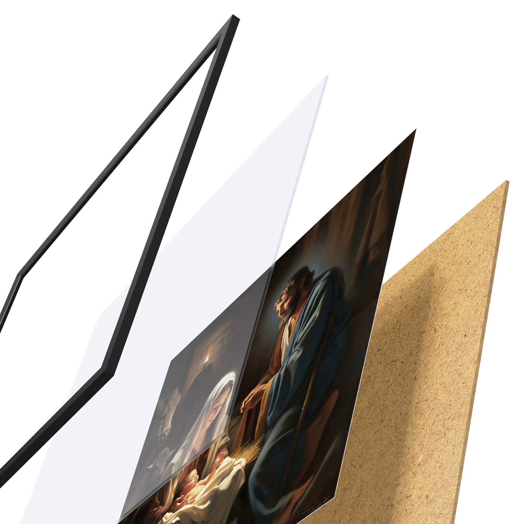 De poster bestaat uit een frame, plexiglas, geprinte afbeelding en spaanplaat achterkant. De poster kan meteen aan de muur worden gehangen dankzij de bevestigingen op de achterkant.