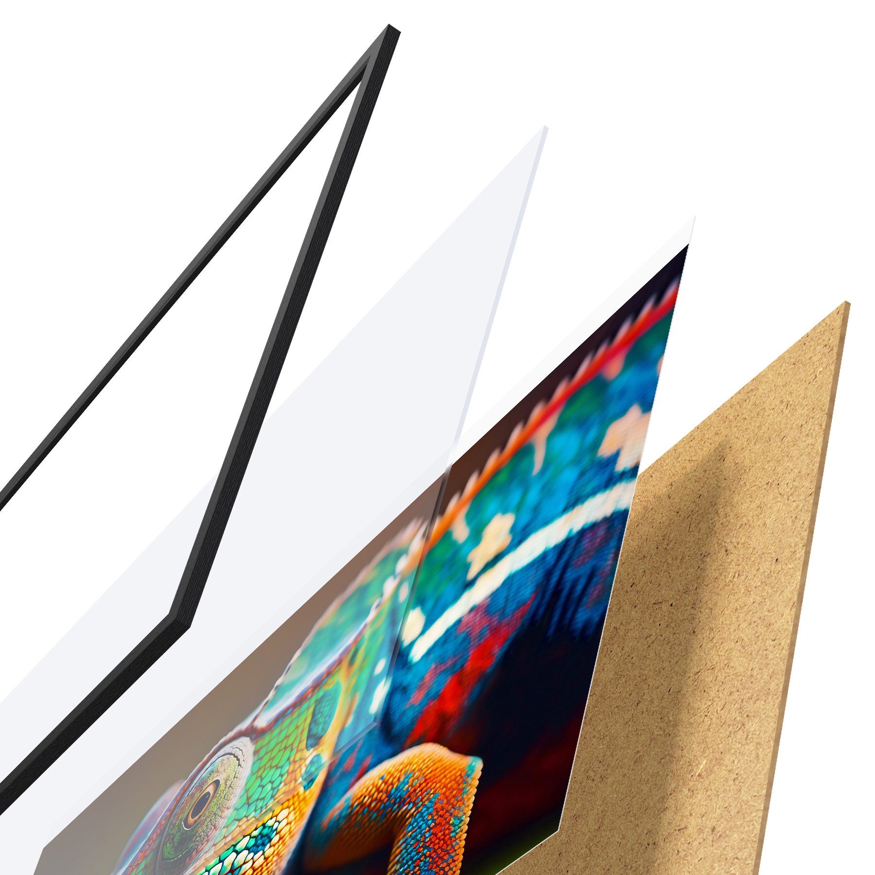 De poster bestaat uit een frame, plexiglas, geprinte afbeelding en spaanplaat achterkant. De poster kan meteen aan de muur worden gehangen dankzij de bevestigingen op de achterkant.