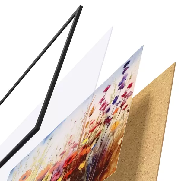 De poster bestaat uit een frame, plexiglas, geprinte afbeelding en spaanplaat achterkant. De poster kan meteen aan de muur worden gehangen dankzij de bevestigingen op de achterkant.