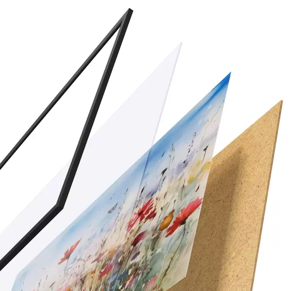 De poster bestaat uit een frame, plexiglas, geprinte afbeelding en spaanplaat achterkant. De poster kan meteen aan de muur worden gehangen dankzij de bevestigingen op de achterkant.