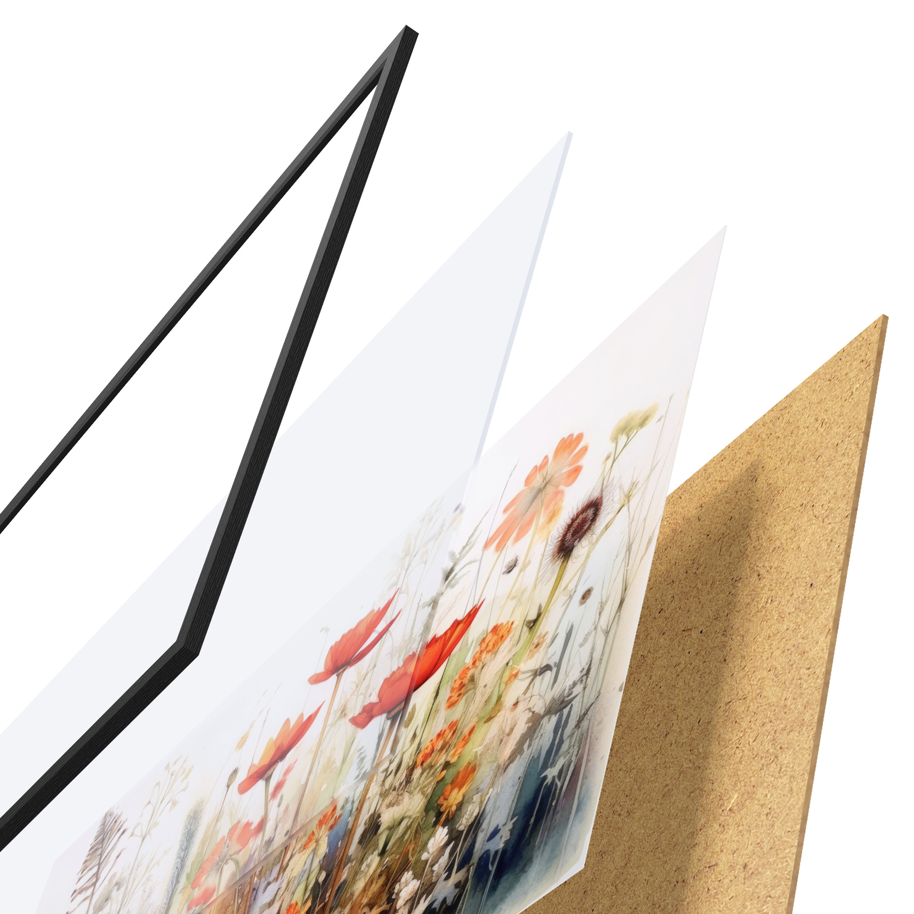 De poster bestaat uit een frame, plexiglas, geprinte afbeelding en spaanplaat achterkant. De poster kan meteen aan de muur worden gehangen dankzij de bevestigingen op de achterkant.
