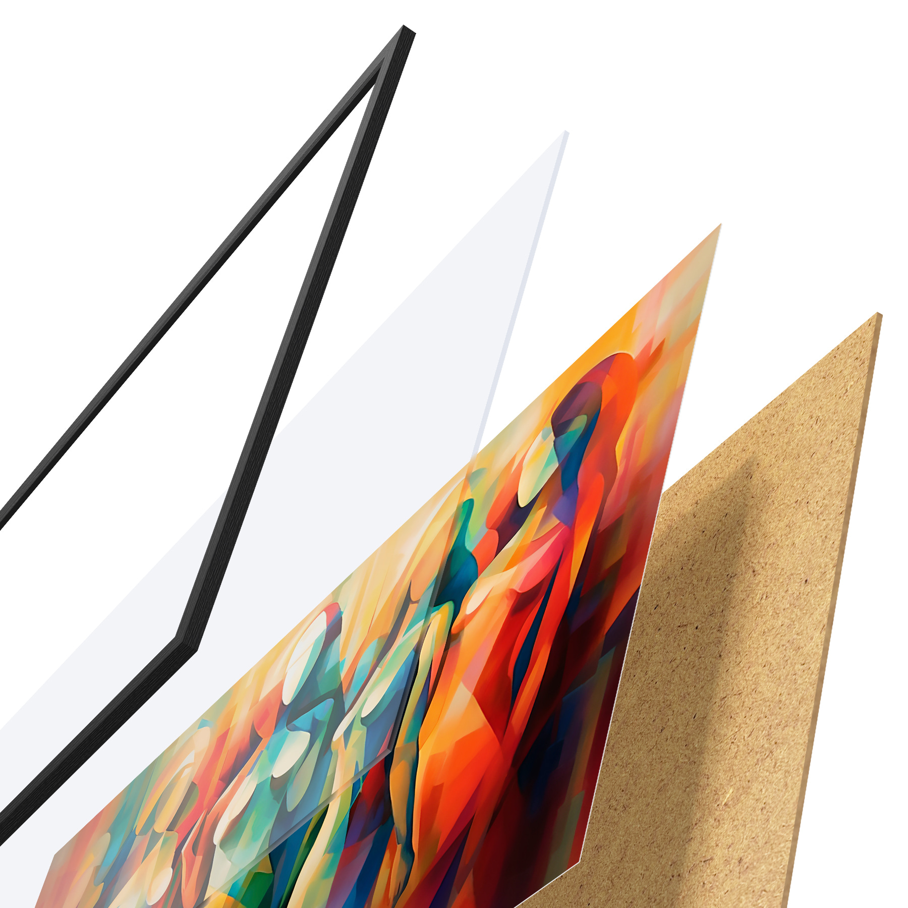 De poster bestaat uit een frame, plexiglas, geprinte afbeelding en spaanplaat achterkant. De poster kan meteen aan de muur worden gehangen dankzij de bevestigingen op de achterkant.