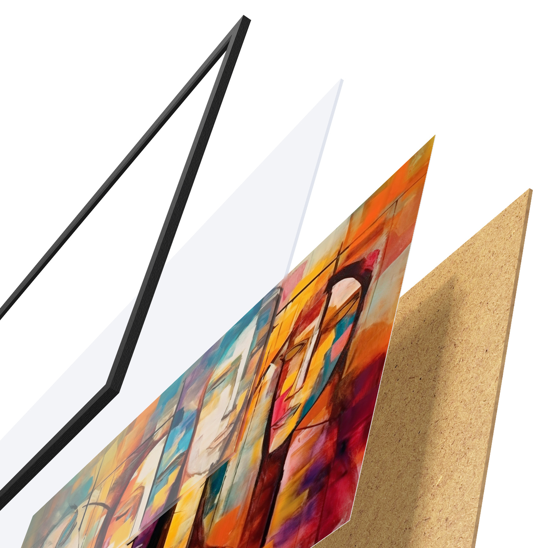 De poster bestaat uit een frame, plexiglas, geprinte afbeelding en spaanplaat achterkant. De poster kan meteen aan de muur worden gehangen dankzij de bevestigingen op de achterkant.