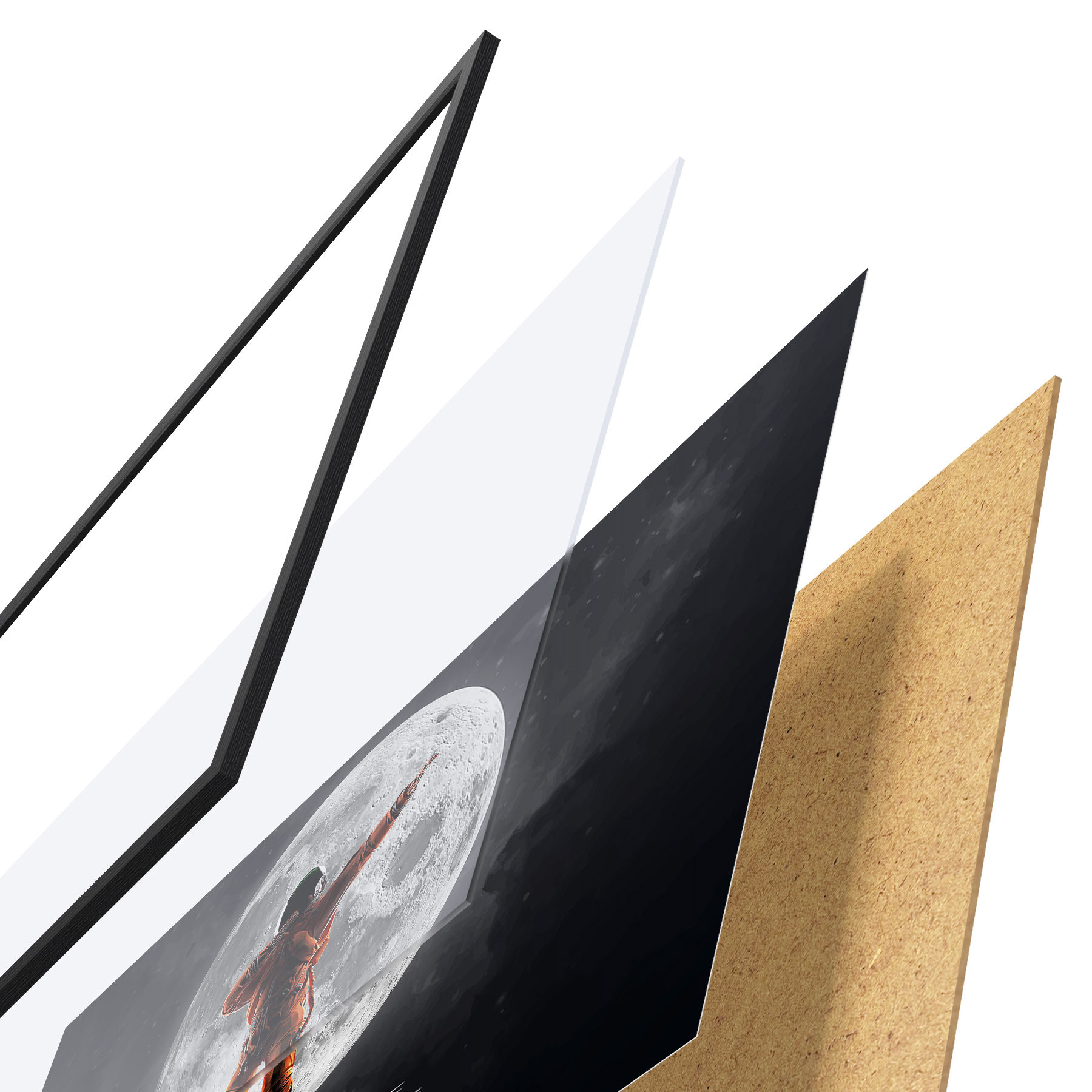 De poster bestaat uit een frame, plexiglas, geprinte afbeelding en spaanplaat achterkant. De poster kan meteen aan de muur worden gehangen dankzij de bevestigingen op de achterkant.