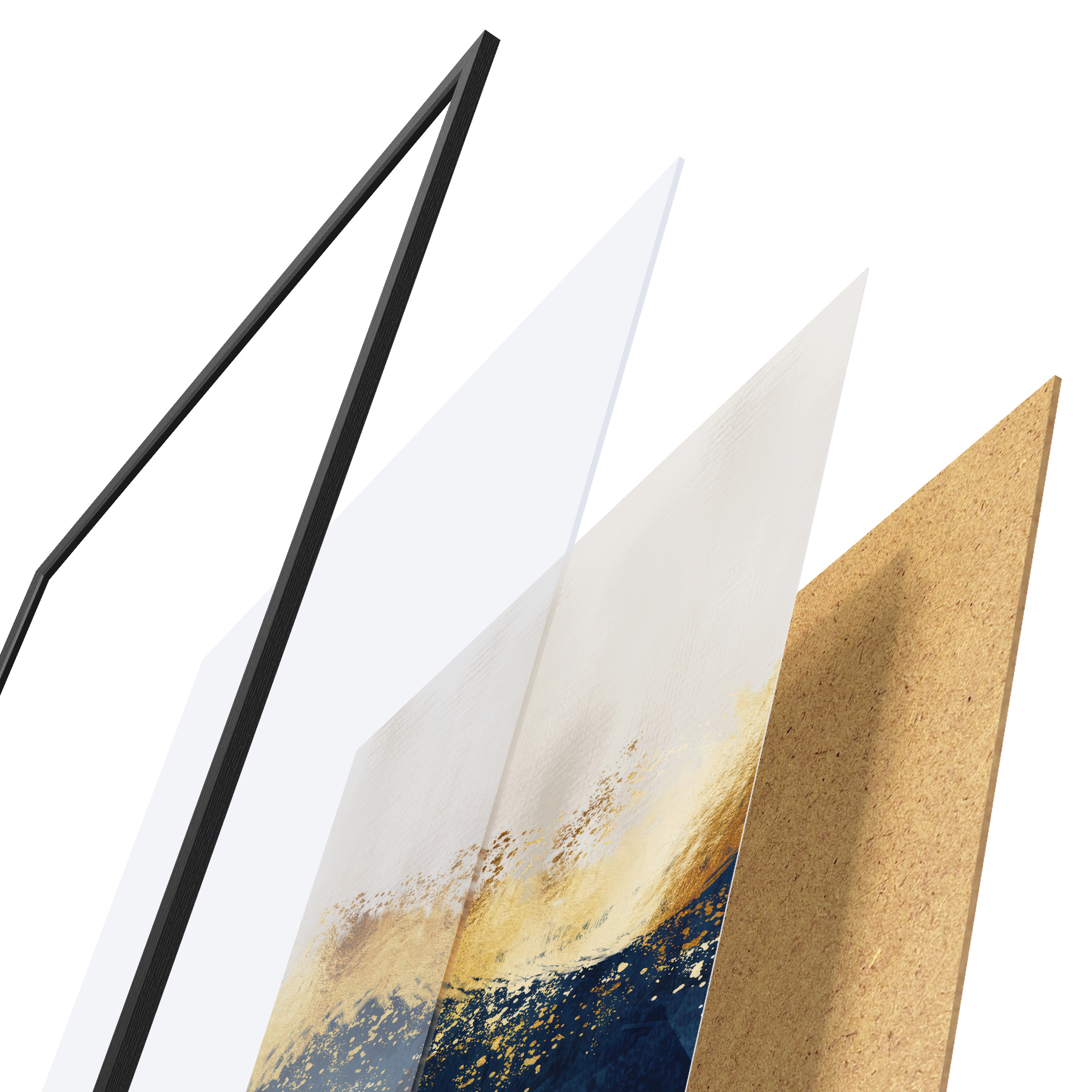 De poster bestaat uit een frame, plexiglas, geprinte afbeelding en spaanplaat achterkant. De poster kan meteen aan de muur worden gehangen dankzij de bevestigingen op de achterkant.