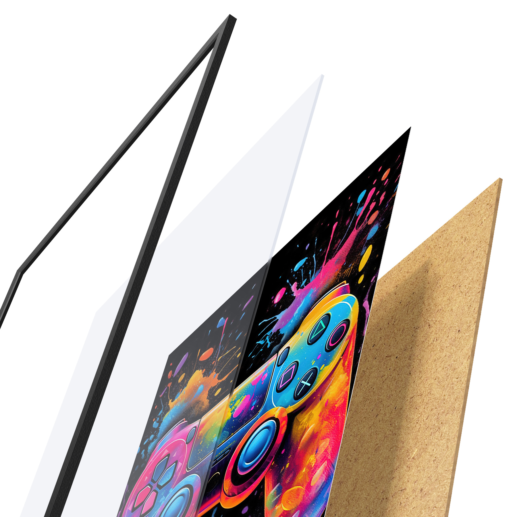 De poster bestaat uit een frame, plexiglas, geprinte afbeelding en spaanplaat achterkant. De poster kan meteen aan de muur worden gehangen dankzij de bevestigingen op de achterkant.