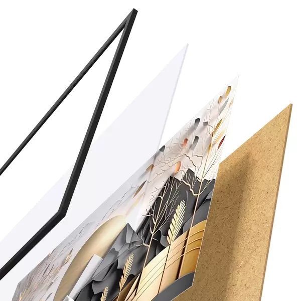 De poster bestaat uit een frame, plexiglas, geprinte afbeelding en spaanplaat achterkant. De poster kan meteen aan de muur worden gehangen dankzij de bevestigingen op de achterkant.