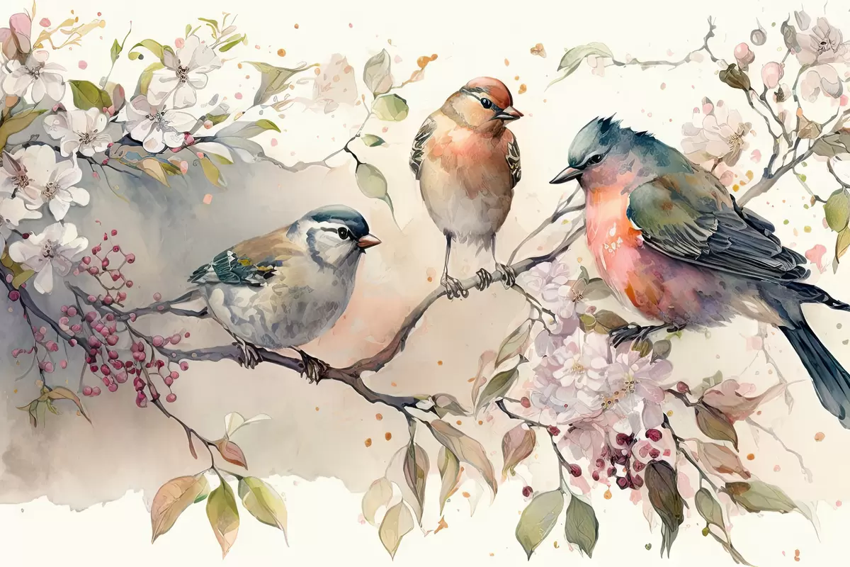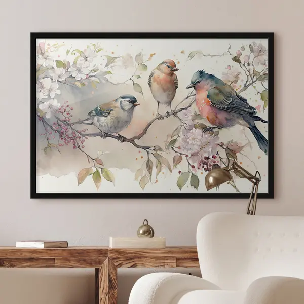 Poster Kleurrijke vogels zaten tussen de bloesems Nr f34490