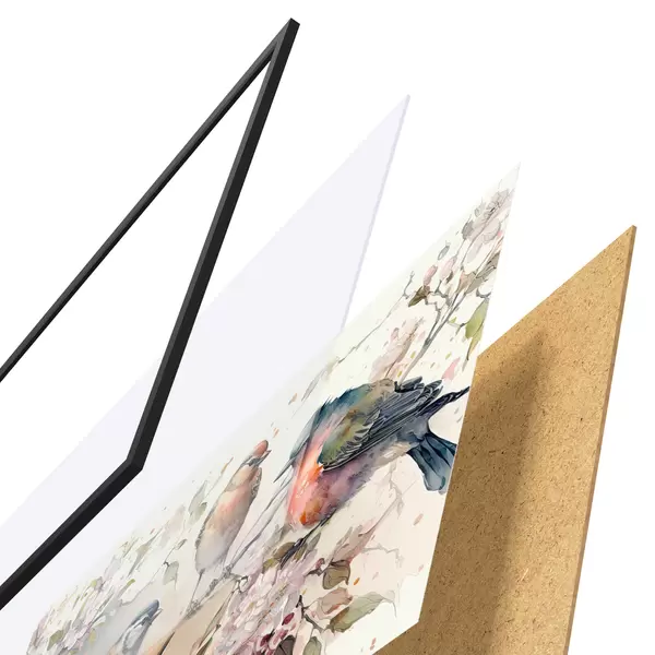De poster bestaat uit een frame, plexiglas, geprinte afbeelding en spaanplaat achterkant. De poster kan meteen aan de muur worden gehangen dankzij de bevestigingen op de achterkant.