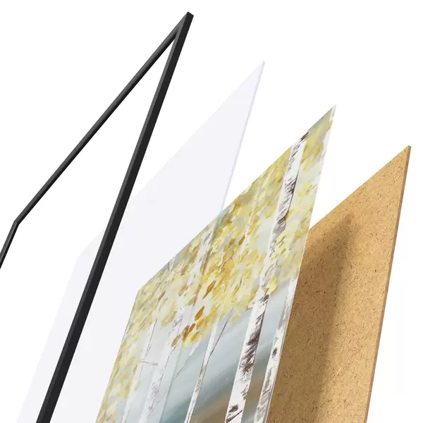 De poster bestaat uit een frame, plexiglas, geprinte afbeelding en spaanplaat achterkant. De poster kan meteen aan de muur worden gehangen dankzij de bevestigingen op de achterkant.
