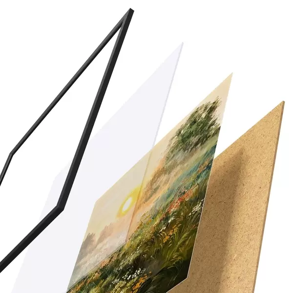 De poster bestaat uit een frame, plexiglas, geprinte afbeelding en spaanplaat achterkant. De poster kan meteen aan de muur worden gehangen dankzij de bevestigingen op de achterkant.