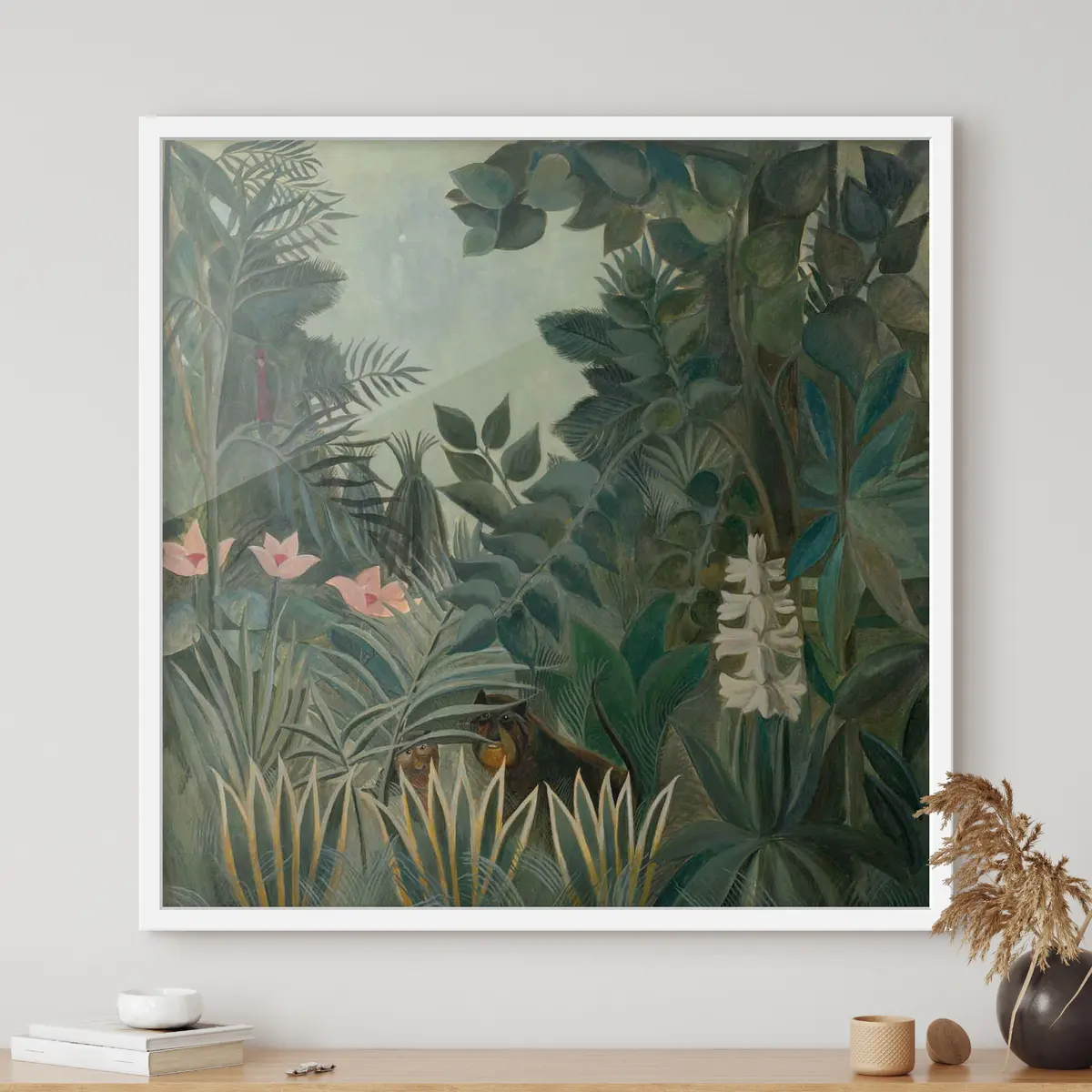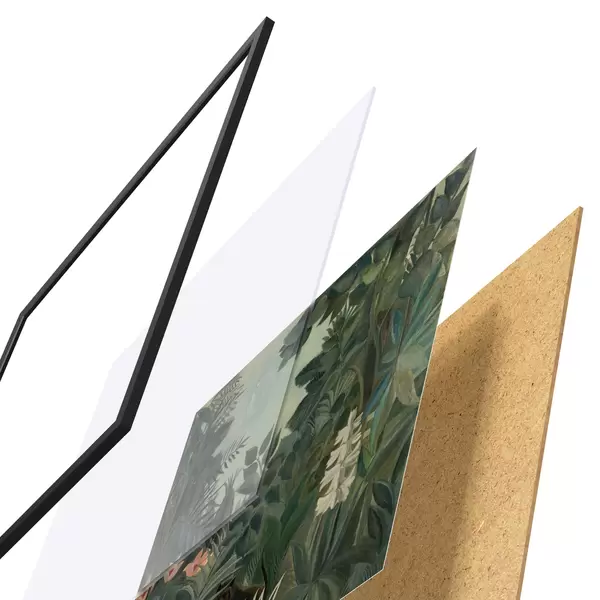 De poster bestaat uit een frame, plexiglas, geprinte afbeelding en spaanplaat achterkant. De poster kan meteen aan de muur worden gehangen dankzij de bevestigingen op de achterkant.
