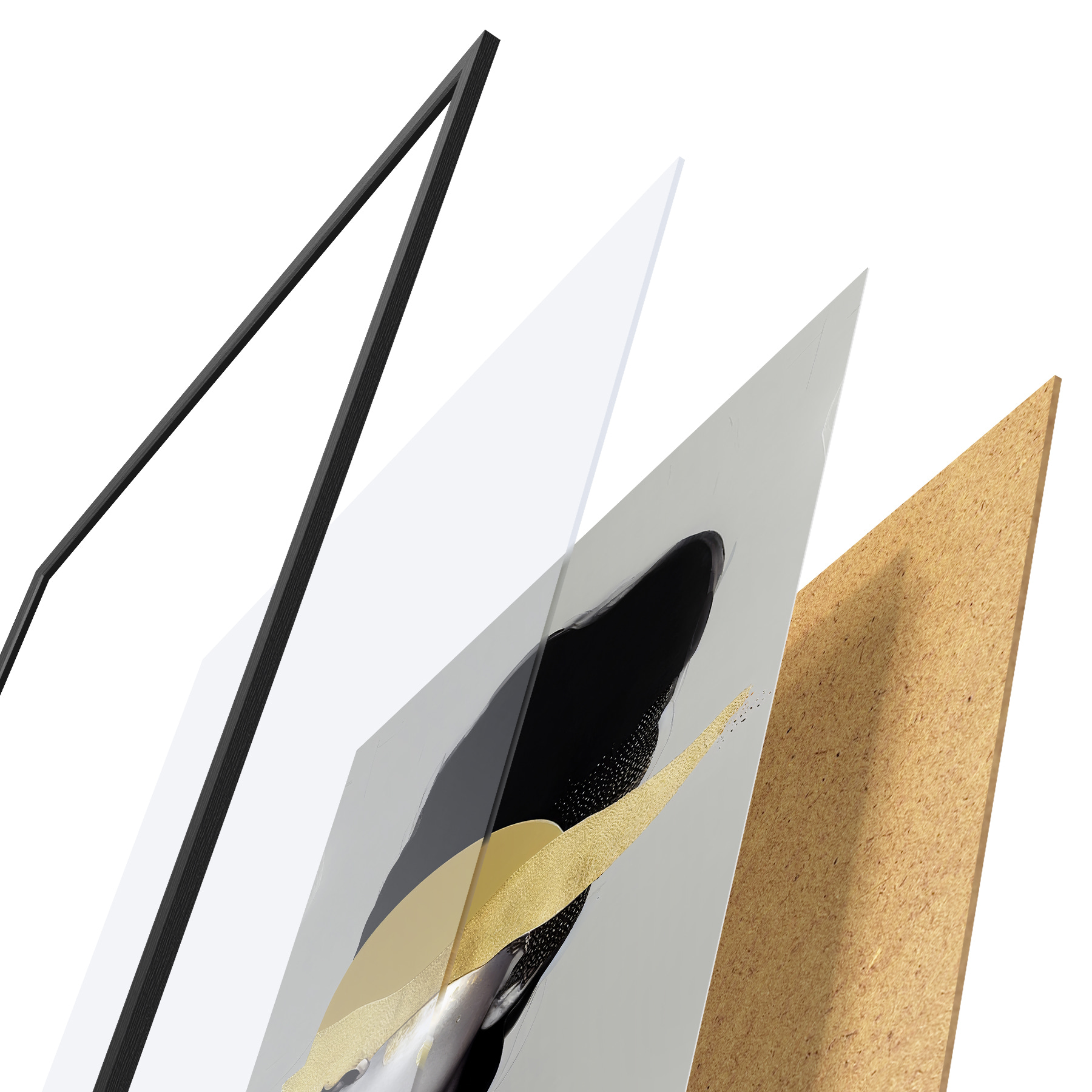 De poster bestaat uit een frame, plexiglas, geprinte afbeelding en spaanplaat achterkant. De poster kan meteen aan de muur worden gehangen dankzij de bevestigingen op de achterkant.
