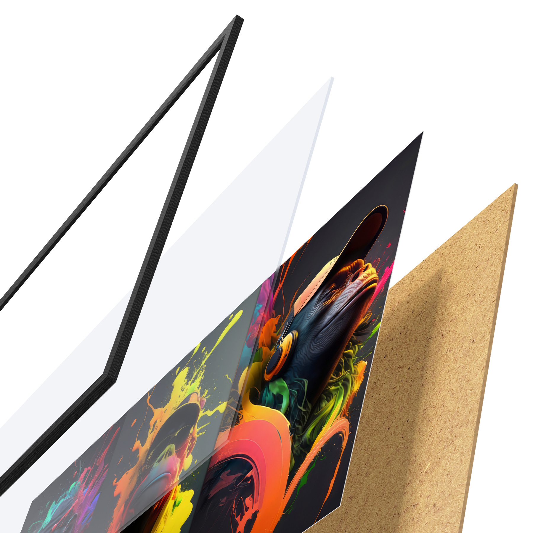 De poster bestaat uit een frame, plexiglas, geprinte afbeelding en spaanplaat achterkant. De poster kan meteen aan de muur worden gehangen dankzij de bevestigingen op de achterkant.