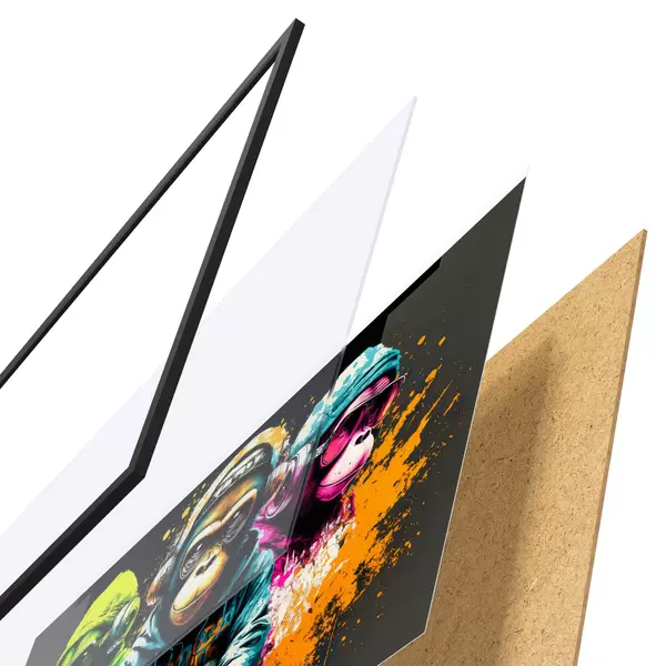 De poster bestaat uit een frame, plexiglas, geprinte afbeelding en spaanplaat achterkant. De poster kan meteen aan de muur worden gehangen dankzij de bevestigingen op de achterkant.