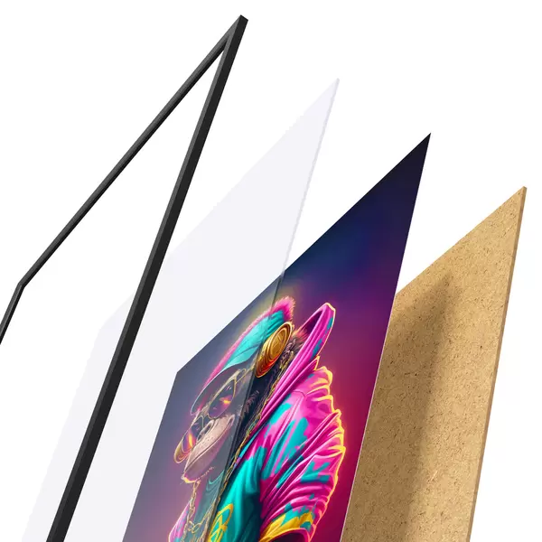 De poster bestaat uit een frame, plexiglas, geprinte afbeelding en spaanplaat achterkant. De poster kan meteen aan de muur worden gehangen dankzij de bevestigingen op de achterkant.