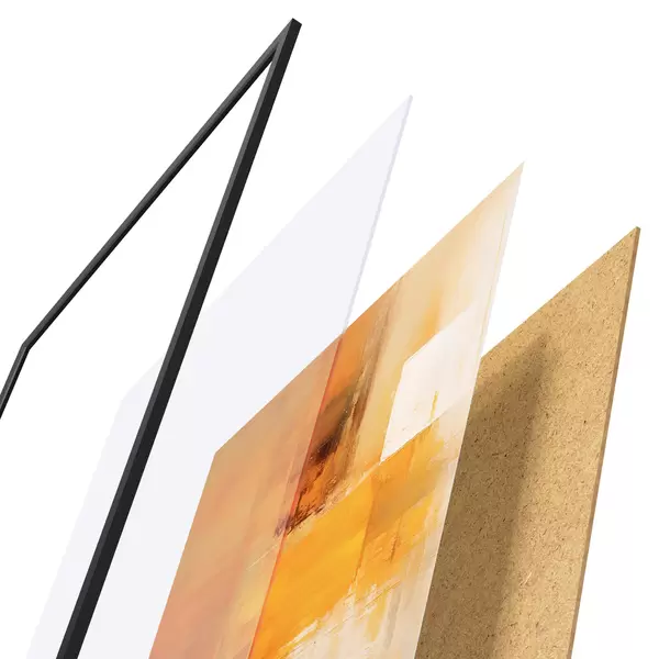 De poster bestaat uit een frame, plexiglas, geprinte afbeelding en spaanplaat achterkant. De poster kan meteen aan de muur worden gehangen dankzij de bevestigingen op de achterkant.