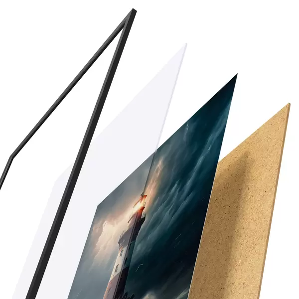 De poster bestaat uit een frame, plexiglas, geprinte afbeelding en spaanplaat achterkant. De poster kan meteen aan de muur worden gehangen dankzij de bevestigingen op de achterkant.