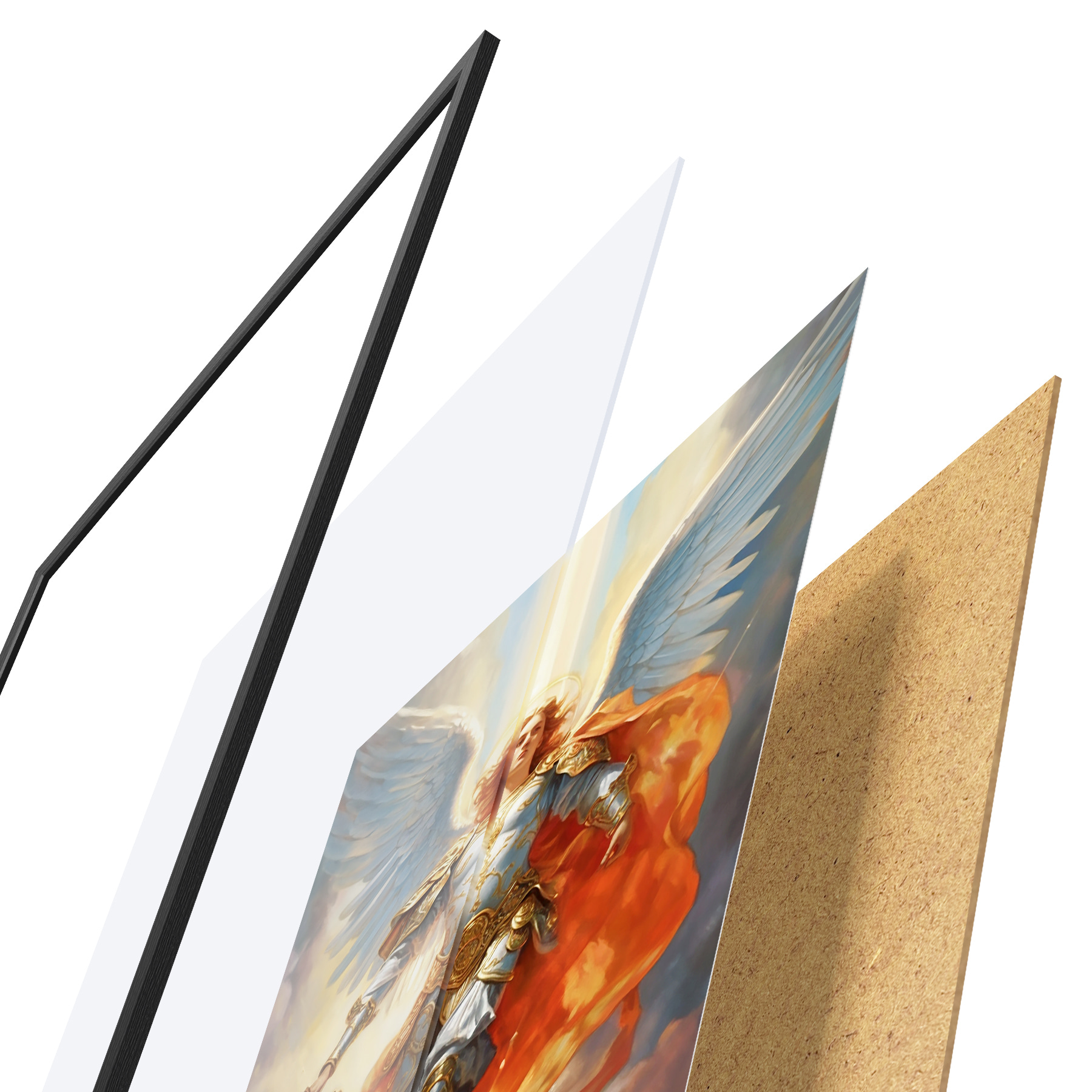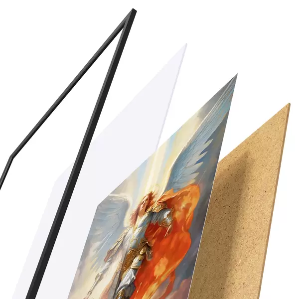 De poster bestaat uit een frame, plexiglas, geprinte afbeelding en spaanplaat achterkant. De poster kan meteen aan de muur worden gehangen dankzij de bevestigingen op de achterkant.
