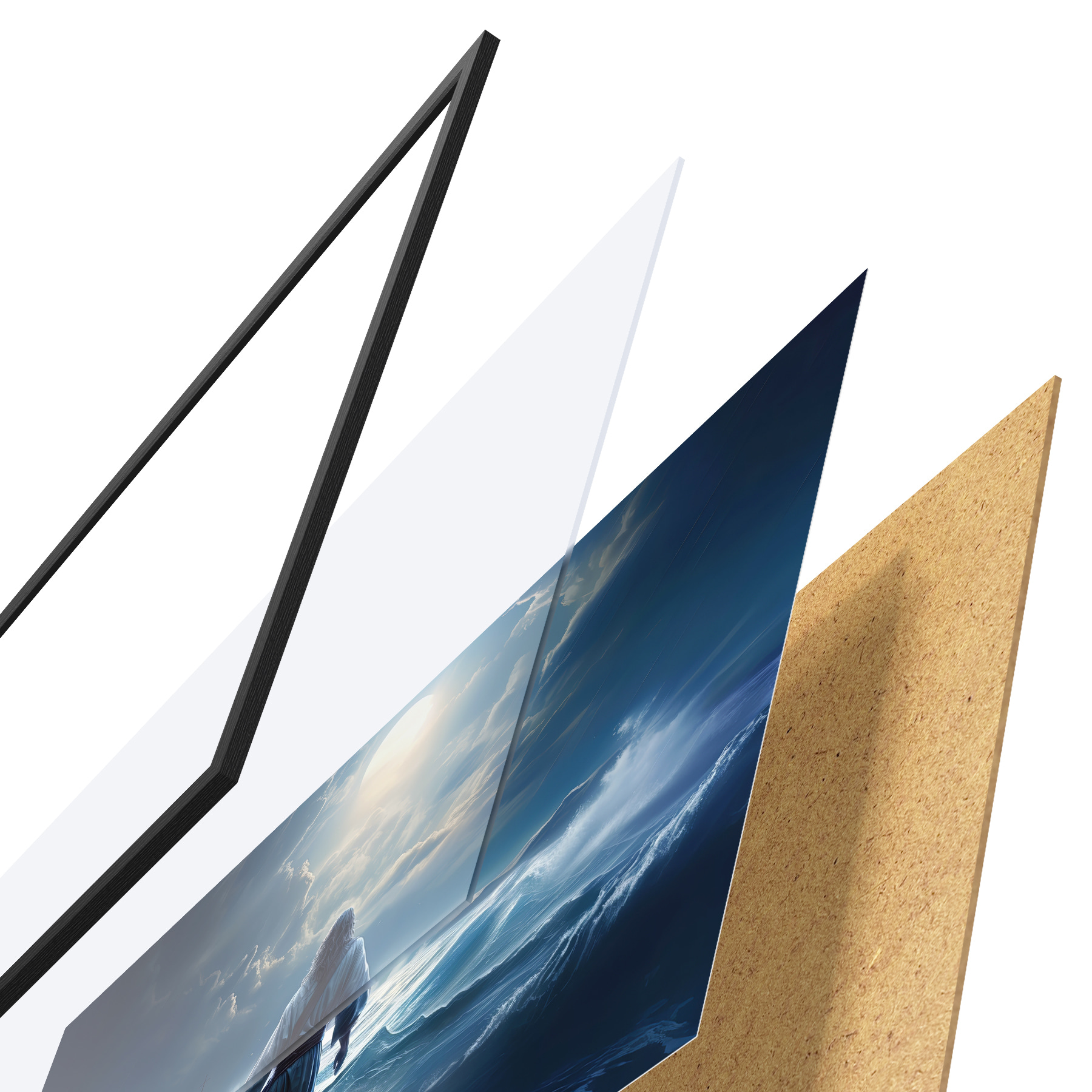 De poster bestaat uit een frame, plexiglas, geprinte afbeelding en spaanplaat achterkant. De poster kan meteen aan de muur worden gehangen dankzij de bevestigingen op de achterkant.