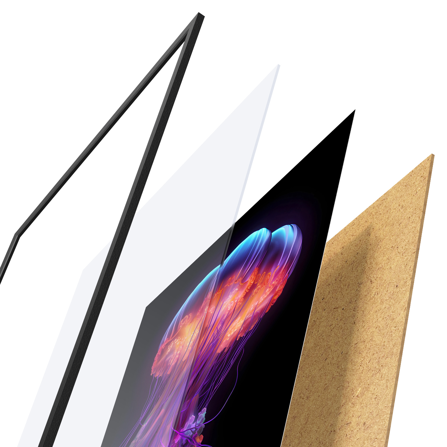 De poster bestaat uit een frame, plexiglas, geprinte afbeelding en spaanplaat achterkant. De poster kan meteen aan de muur worden gehangen dankzij de bevestigingen op de achterkant.