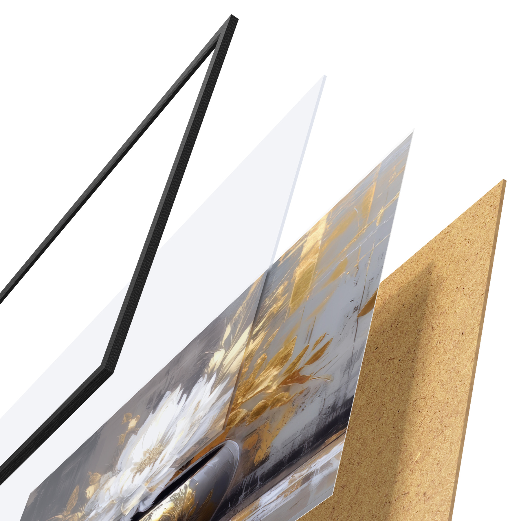 De poster bestaat uit een frame, plexiglas, geprinte afbeelding en spaanplaat achterkant. De poster kan meteen aan de muur worden gehangen dankzij de bevestigingen op de achterkant.
