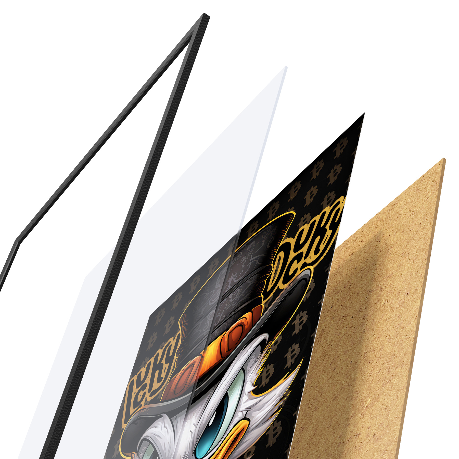 De poster bestaat uit een frame, plexiglas, geprinte afbeelding en spaanplaat achterkant. De poster kan meteen aan de muur worden gehangen dankzij de bevestigingen op de achterkant.