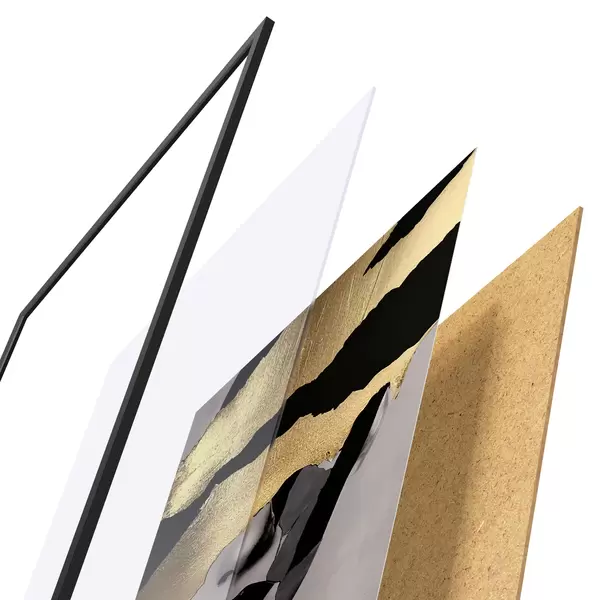 De poster bestaat uit een frame, plexiglas, geprinte afbeelding en spaanplaat achterkant. De poster kan meteen aan de muur worden gehangen dankzij de bevestigingen op de achterkant.