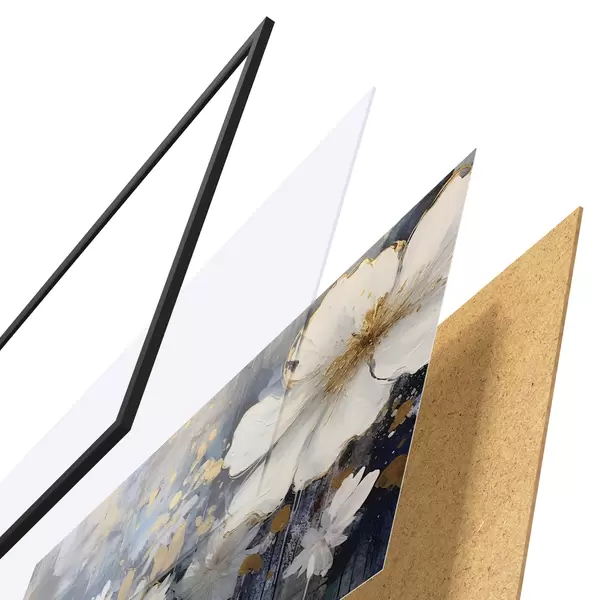 De poster bestaat uit een frame, plexiglas, geprinte afbeelding en spaanplaat achterkant. De poster kan meteen aan de muur worden gehangen dankzij de bevestigingen op de achterkant.