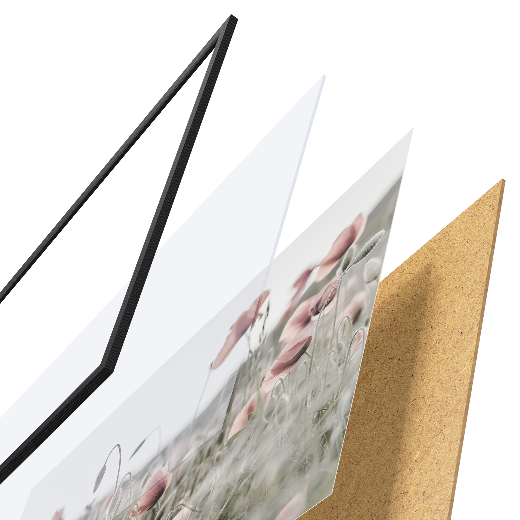 De poster bestaat uit een frame, plexiglas, geprinte afbeelding en spaanplaat achterkant. De poster kan meteen aan de muur worden gehangen dankzij de bevestigingen op de achterkant.