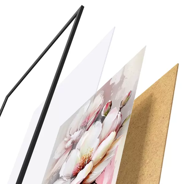 De poster bestaat uit een frame, plexiglas, geprinte afbeelding en spaanplaat achterkant. De poster kan meteen aan de muur worden gehangen dankzij de bevestigingen op de achterkant.