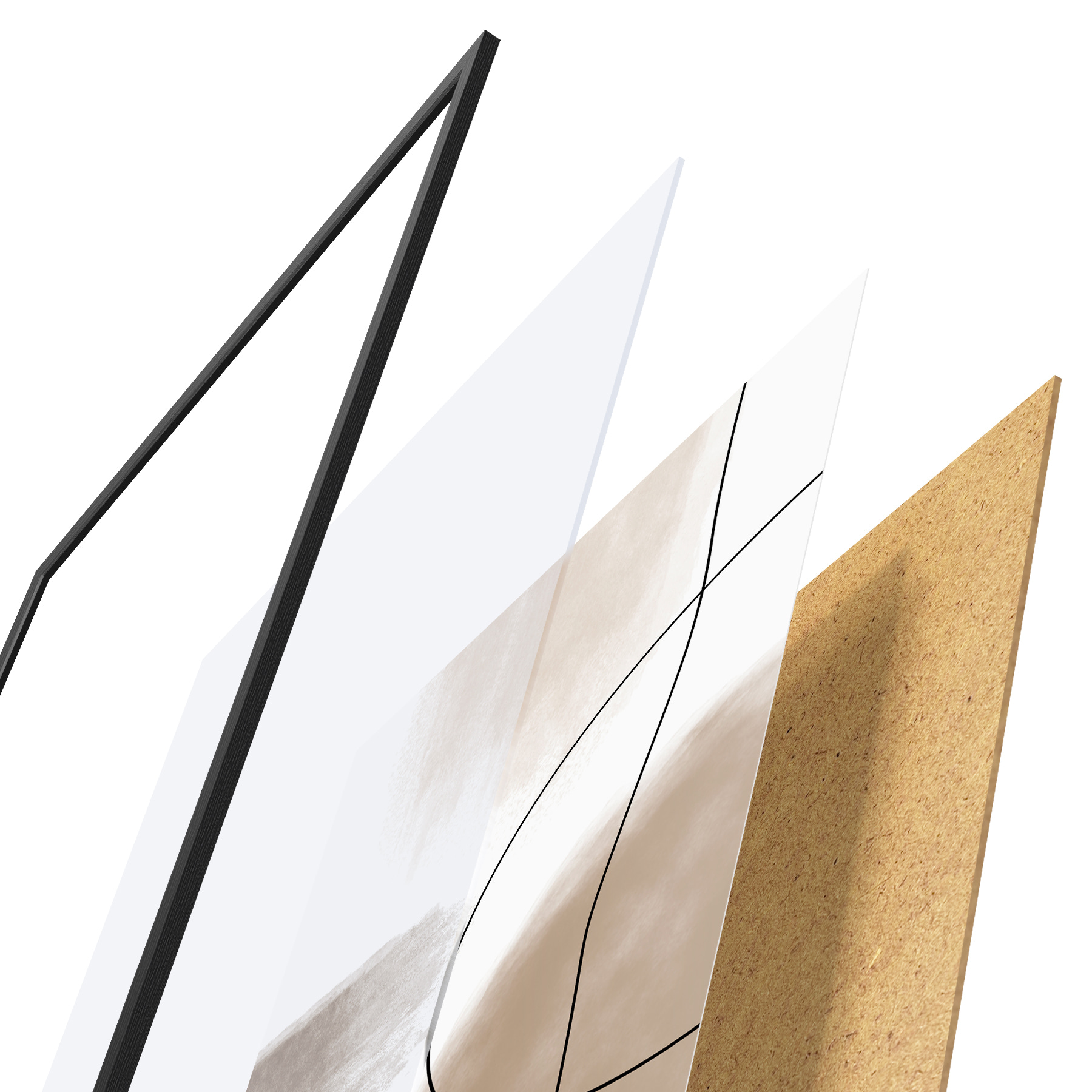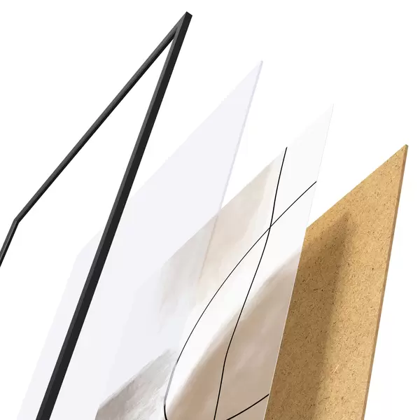 De poster bestaat uit een frame, plexiglas, geprinte afbeelding en spaanplaat achterkant. De poster kan meteen aan de muur worden gehangen dankzij de bevestigingen op de achterkant.