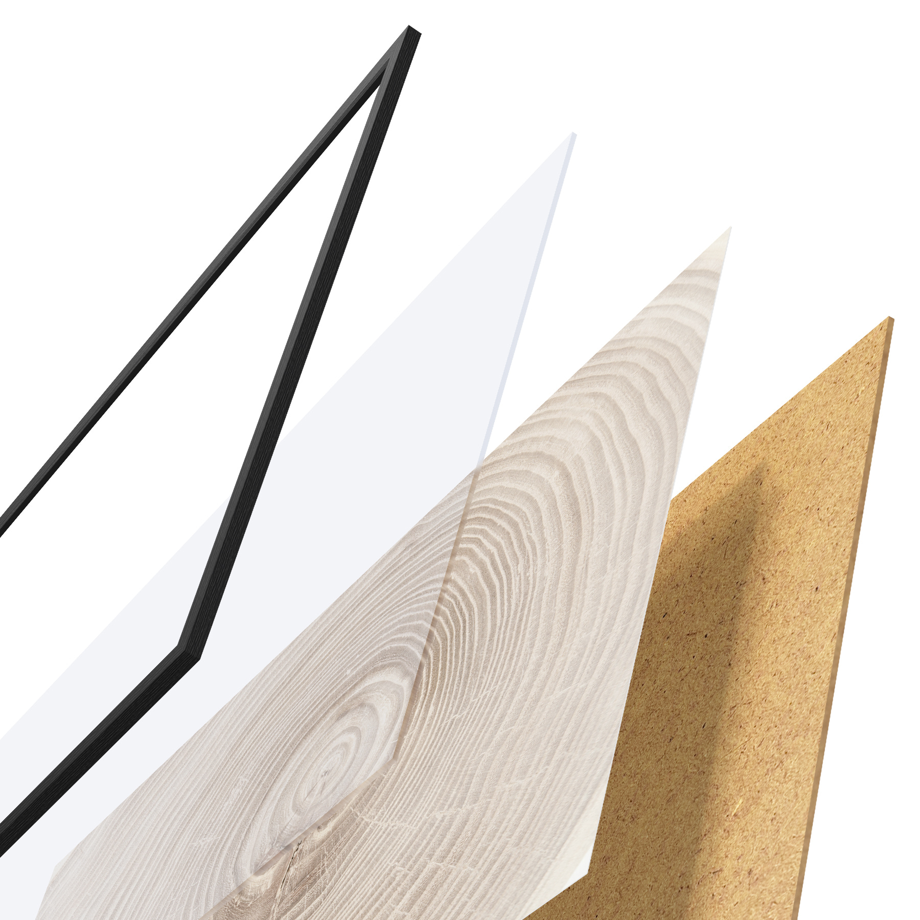 De poster bestaat uit een frame, plexiglas, geprinte afbeelding en spaanplaat achterkant. De poster kan meteen aan de muur worden gehangen dankzij de bevestigingen op de achterkant.