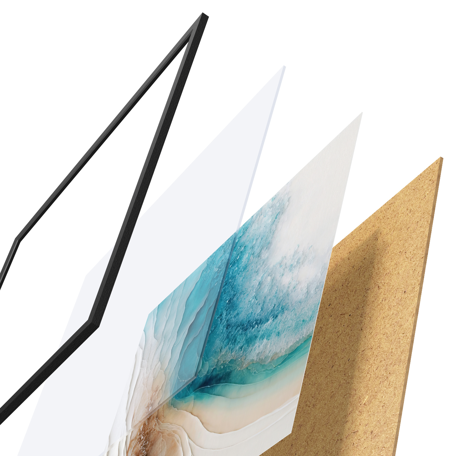 De poster bestaat uit een frame, plexiglas, geprinte afbeelding en spaanplaat achterkant. De poster kan meteen aan de muur worden gehangen dankzij de bevestigingen op de achterkant.
