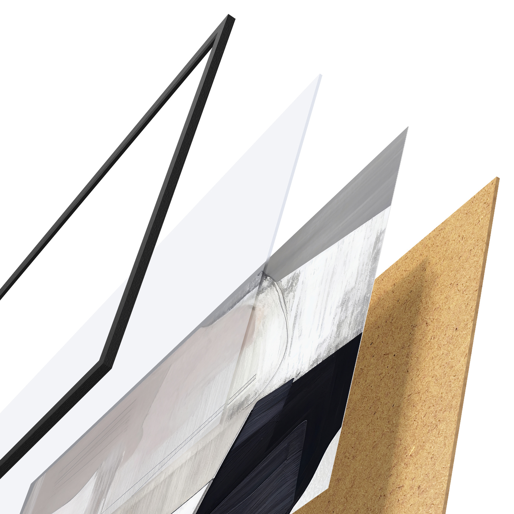 De poster bestaat uit een frame, plexiglas, geprinte afbeelding en spaanplaat achterkant. De poster kan meteen aan de muur worden gehangen dankzij de bevestigingen op de achterkant.